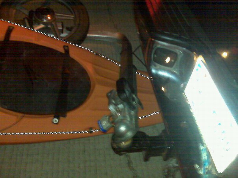When the trailer flew up into the air it landed in the lane next to us and bent the tongue at a 90 degree angle. The bow of kayak slipped under the tongue and the trailer landed on top of the kayak. We were doing 70 mph at the time and the bow of the kayak was ground into the pavement.